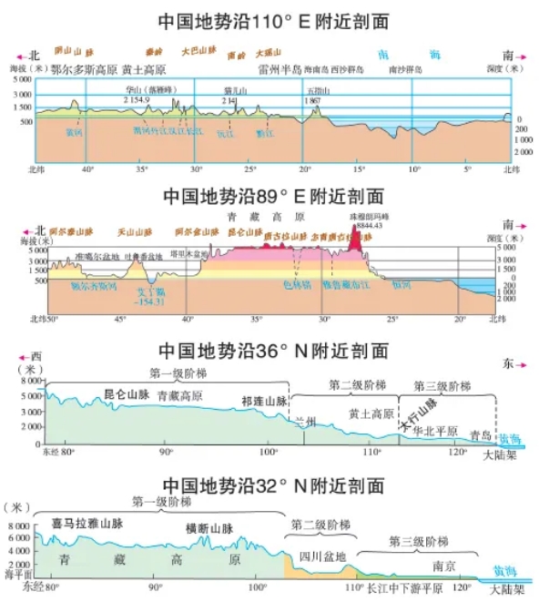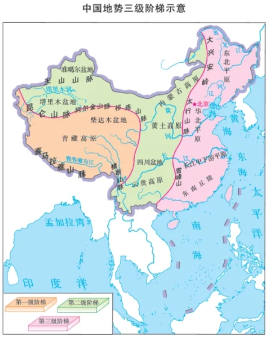 三級階梯的驚天布局   中國的地形像一座巨大的階梯,自西向東逐級下降,形成全球罕見的"三級階梯"地貌,這直接決定了我國人口分布、經(jīng)濟(jì)發(fā)展甚至歷史進(jìn)程。