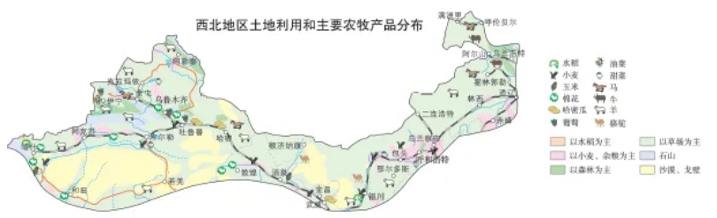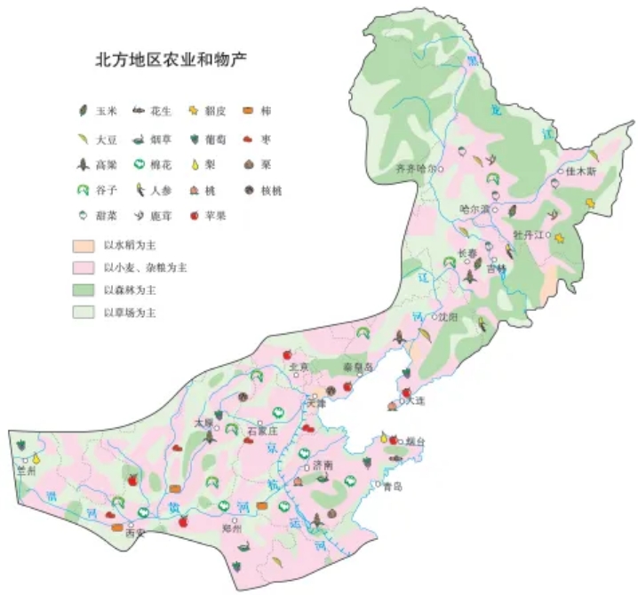 小麥:華北平原("中國糧倉")、新疆(優(yōu)質(zhì)強(qiáng)筋麥)