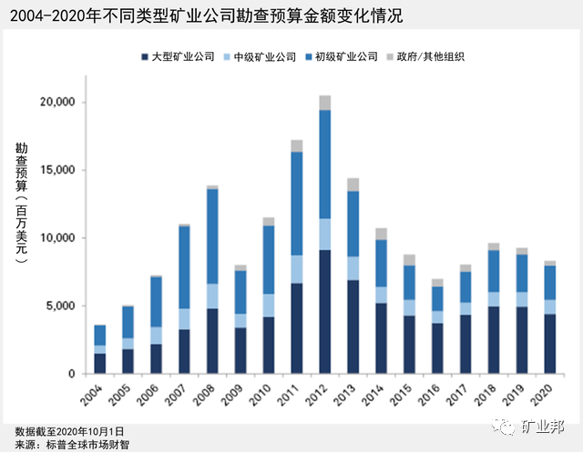 中級礦業(yè)公司增加了后期和礦場階段的預算,分別同比增長了3%和9%,但這并沒有抵消草根階段勘查預算下降9100萬美元的額度。