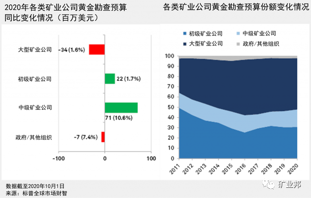 漲跌幅方面大型礦業(yè)公司的黃金勘查預算同比下降1.6%,初級和中級礦業(yè)公司分別增長1.7%和10.6%。