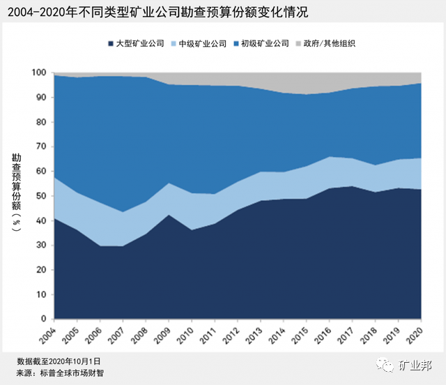 所有類型的公司都在逐年減少草根勘探的預算,而初級和中級礦業(yè)公司都增加了近礦工作的預算。