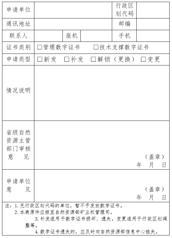 九、數(shù)字證書(shū)應(yīng)嚴(yán)格管理,規(guī)范使用。地方各級(jí)自然資源主管部門申請(qǐng)新發(fā)、補(bǔ)發(fā)、解鎖(更換)、變更數(shù)字證書(shū)的,需通過(guò)省級(jí)自然資源主管部門向自然資源部提出書(shū)面申請(qǐng)。其中,數(shù)字證書(shū)遺失的應(yīng)及時(shí)向自然資源部掛失。數(shù)字證書(shū)申請(qǐng)表見(jiàn)附件1。
